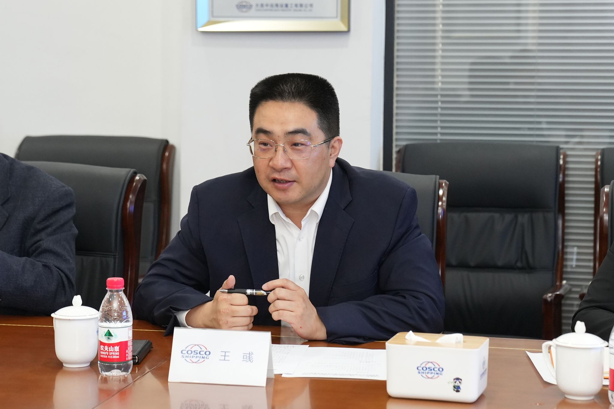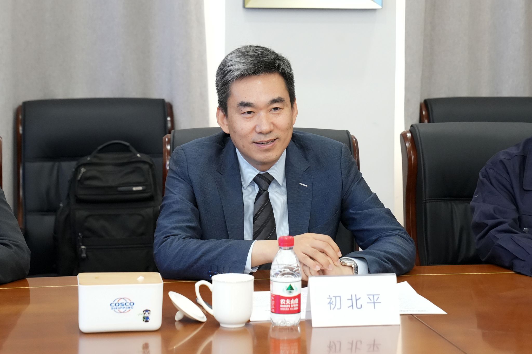王彧代表大连中远海运重工有限公司对初北平一行表示欢迎,并对校企产学研合作的阶段性成果表示祝贺。他简要介绍了公司近期取得的一系列丰硕成果以及海大毕业生在公司的发展情况,并对学校的人才培养质量给予高度肯定,强调“功以才成、业由才广”,希望在科研合作、人才培养、成果转化等方面开展更加广泛深入的交流与合作,为双方共同实现高质量发展寻求新突破,互融共促,实现“1+1>2”的叠加效应。